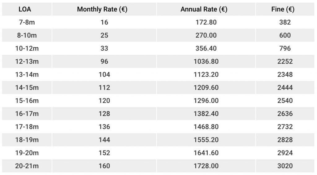 These length brackets are pretty strict too (up to two decimals). So with Caladh being 10.3m, she falls into the 33euro a month bracket.